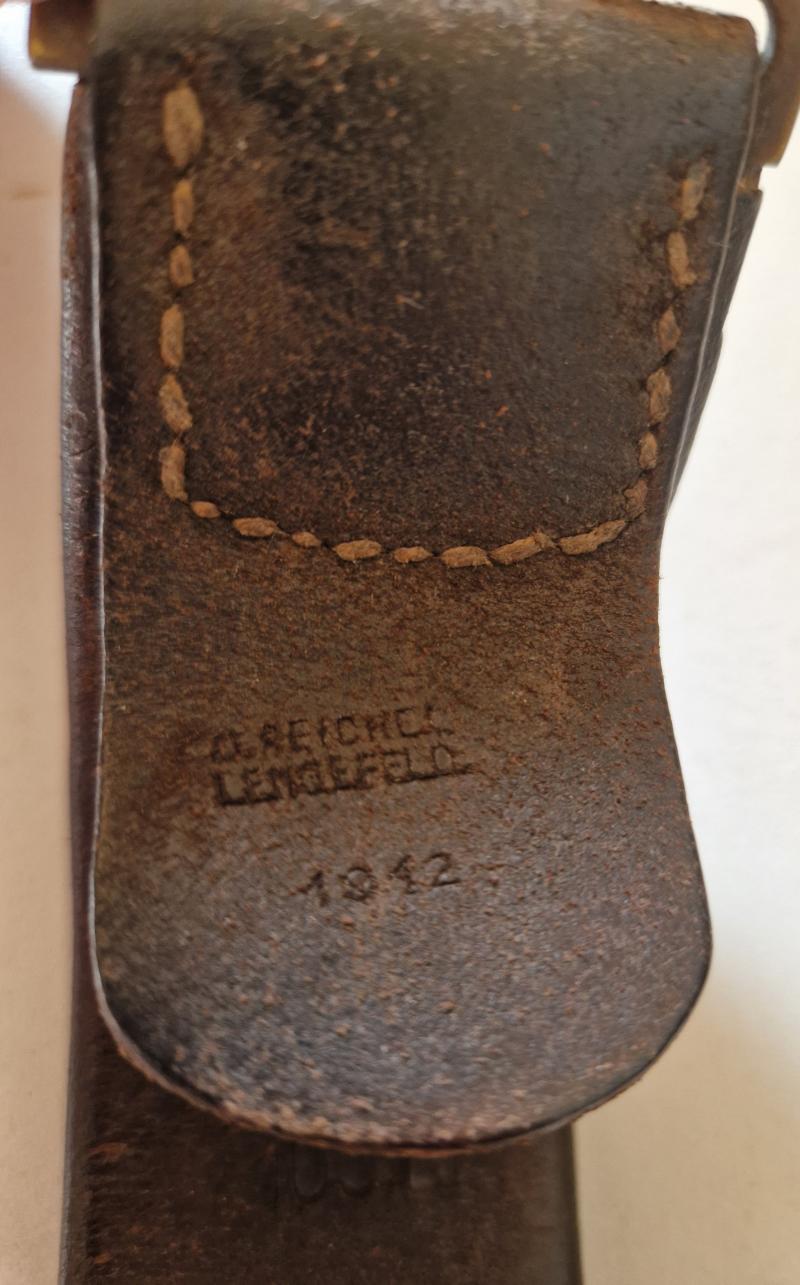 Nice dated and unit marked leather. Leather has wire repair and buckle also held on with wire.