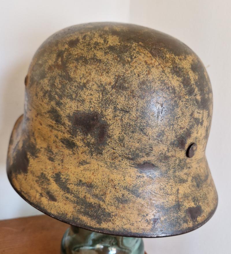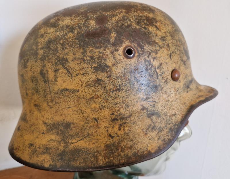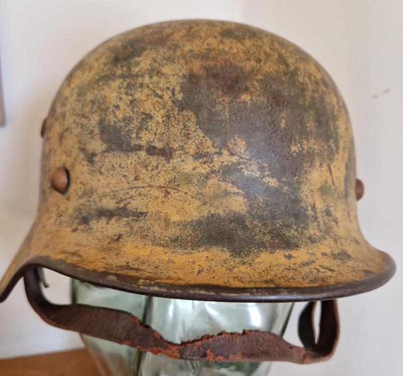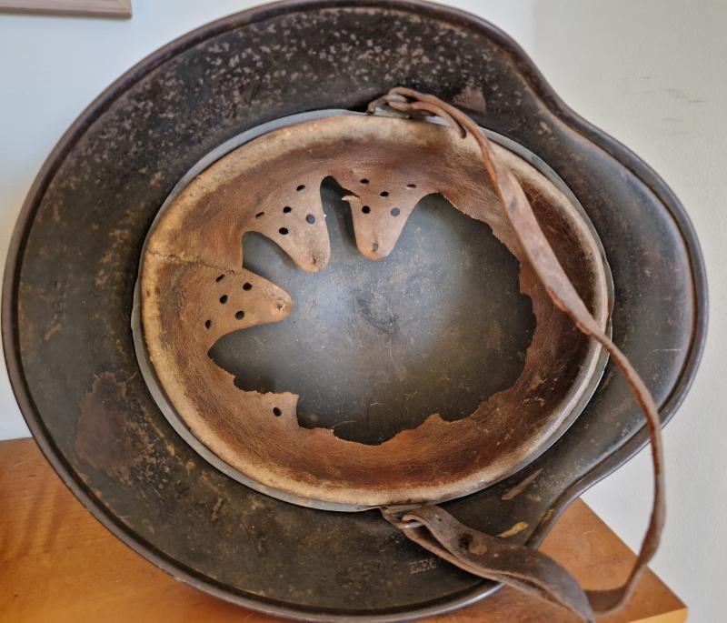Shell is marked EF64 with lot number 2160.Damaged liner is approx size 57 with worn and damaged long section of chinstrap. The two front split pins are replaced post war with original back pin.