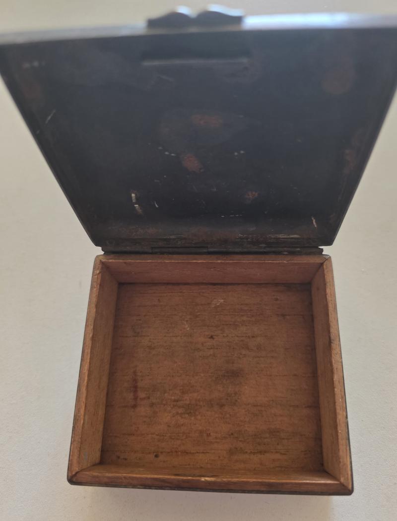 Very nice iron Cross to lid and no damage. Approx 9cm wide,6cm long and 3.5cm deep and wood interior.