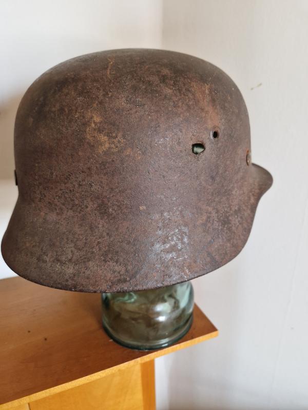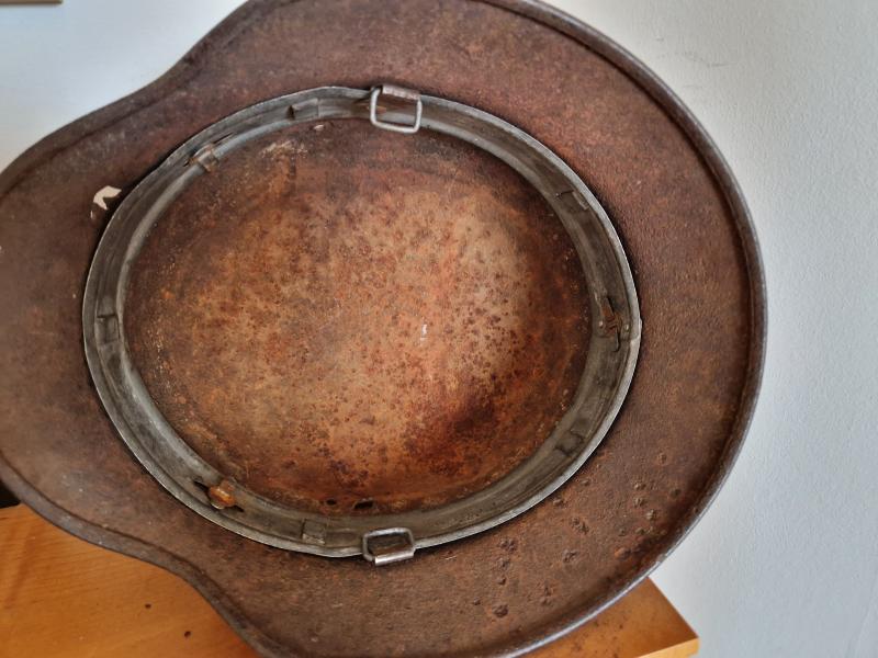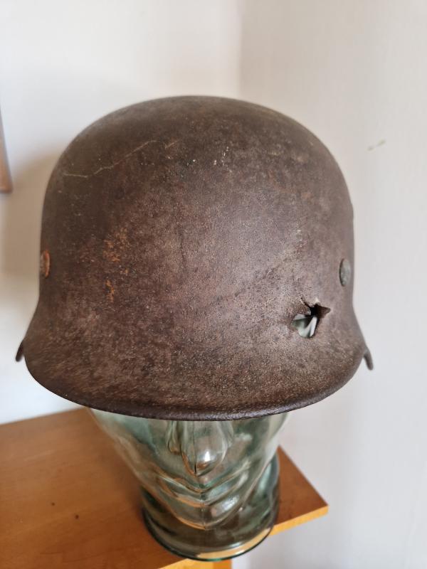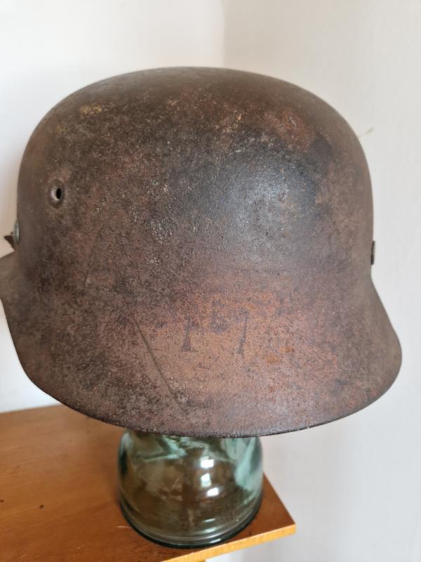 Some camo paint can still be seen mostly to back.Interesting helmet.