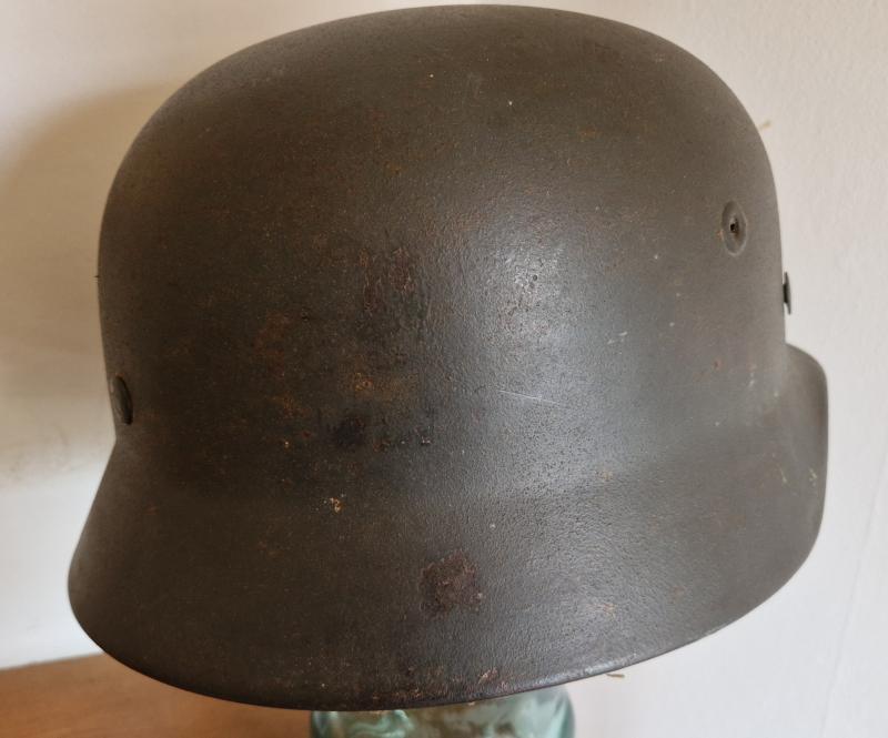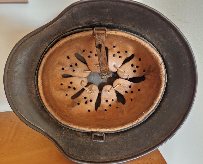 Original liner and buckle section of strap. Decal has been wartime removed. Liner is size marked 58 with NS66 shell.Lot number 0139.