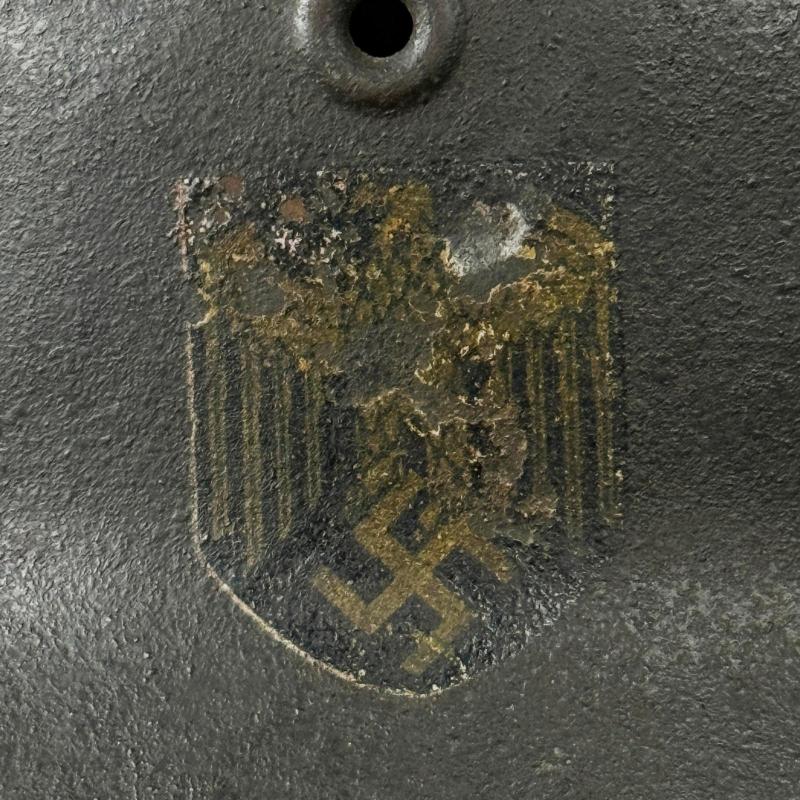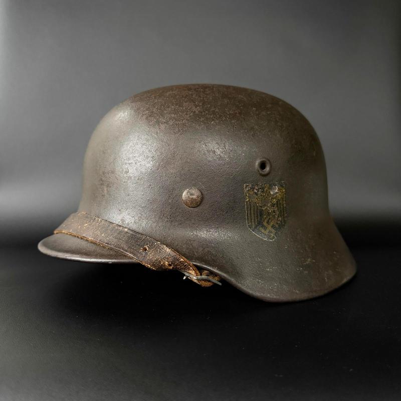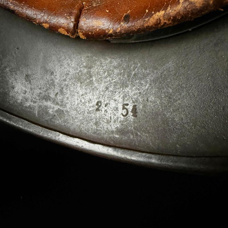 Ef 64 with lot number that appears to be 22454.Original liner and named to the back of inside.Long section of strap is possibly post war.Liner stamped size 56.