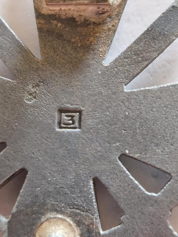 Zinc badge that has 3 maker mark.